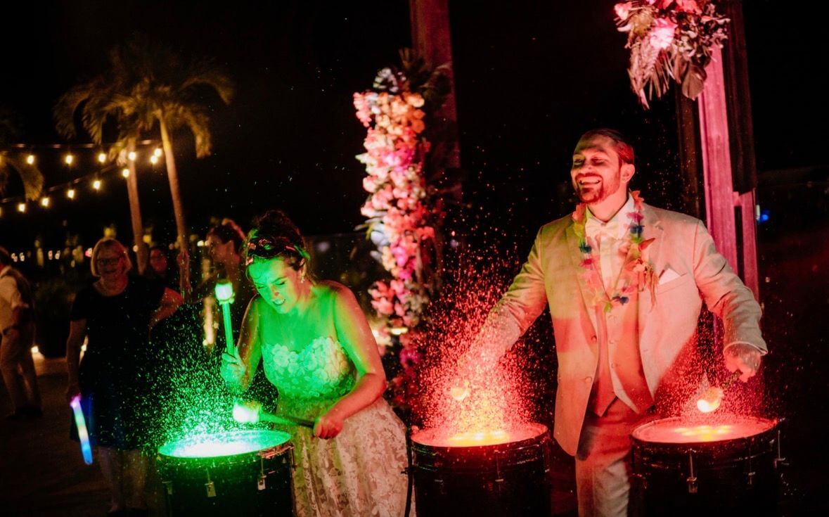We splurged on florals and added an hour-long party package to our reception. Both were incredibly worth it! I didn’t add too much decor other than florals since our venue was so pretty on its own, but our bright, vibrant flowers really stole the show. We also added the Moxche “Hora Loca” to our reception and the Samba dancers brought water drums, played limbo, and did favors for everyone. Our guests were loving it! It was a fun, interactive surprise to add while everyone was already dancing and enjoying themselves. The pictures of our guests banging on the water drums are epic!